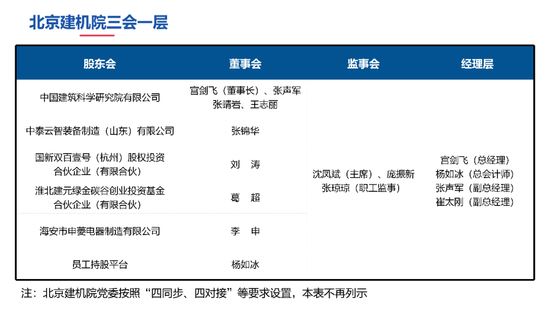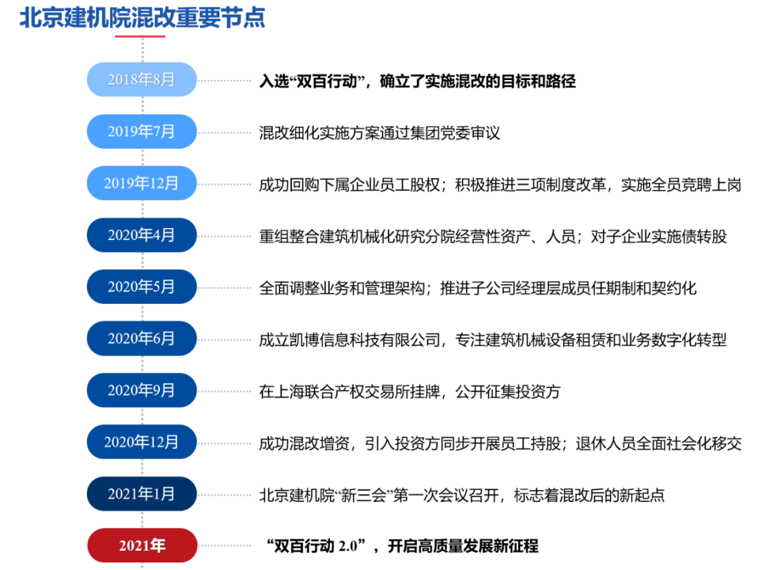 ? ? 2020年12月,北京建機院通過上海聯合產權交易所成功引入中泰云智裝備制造(山東)有限公司、國新雙百壹號(杭州)股權投資合伙企業(有限合伙)、淮北建元綠金碳谷創業投資基金合伙企業(有限合伙)、海安市申菱電器制造有限公司等4家民營企業和金融資本,同步實施員工持股,募集資金近4億元。